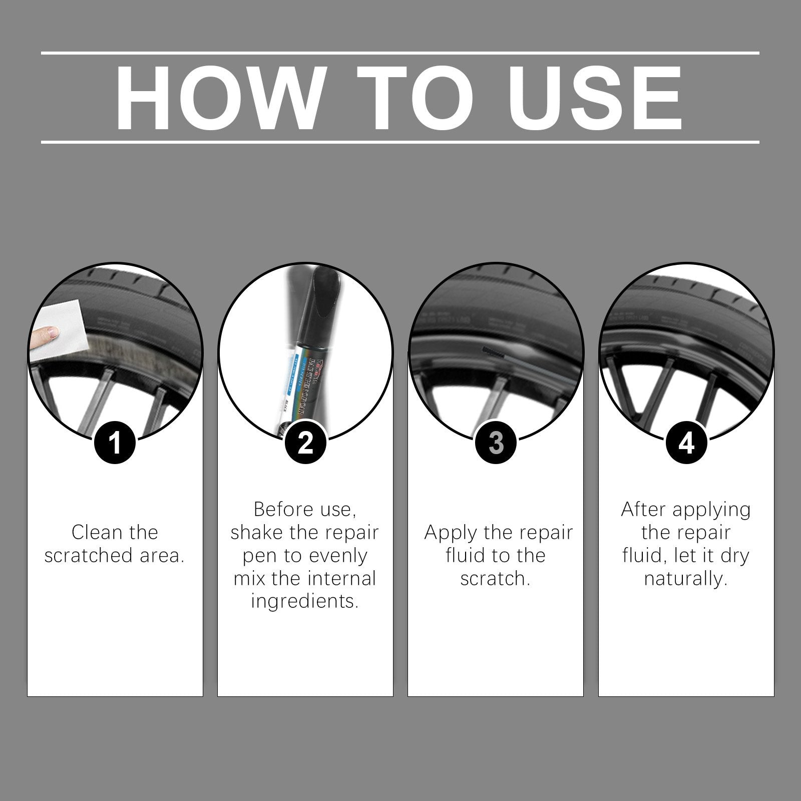 - [Reparasjon av riper] Hvis du parkerer på andre siden av veien, kan hjulene lett få riper, og dette hjulreparasjonssettet kan hjelpe deg med å reparere riper og mindre bulker.